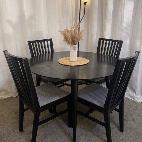 Mio Svend Middelboe rund matbord med vit bordsskiva och metallben. Bordet har en minimalistisk design med tunna, svarta metallben och en slät, vit yta. Passar för matsal eller kök och kan användas för måltider eller som arbetsyta.