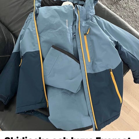 Everest skidbyxa i blå färg, anpassad för vinterbruk. Totalt enbart använda under 2 veckors tid. Byxan har justerbara hängslen och dragkedjor vid benslut för enkel anpassning. Materialet är lämpligt för snö- och kallt väder, med funktioner som skyddar mot fukt och kyla.