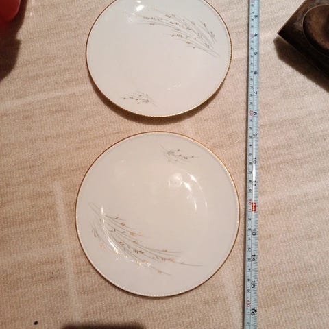 13 koppar med fat och assietter. Ett kakfat, två ljusstakar, en sockerskål och ett litet fat som man t ex kan lägga en tepåse på.