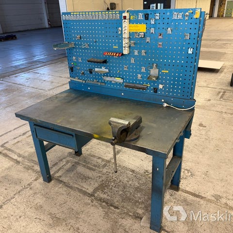 2 st verkstadsbord ESD. Höj och sänkbart, det ena bordet med el och den andra med vev. Hyllor och hurtsar för verktygsförvaring.