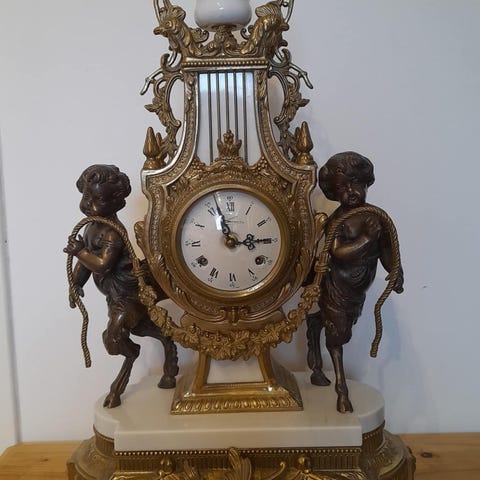 En dekorativ bordsklocka. På undersidan finns en stämpel med texten ”Patent 11.04”. Se bilder för detaljer. Tung.