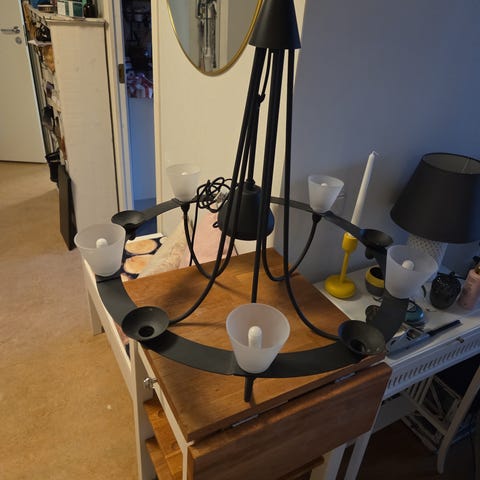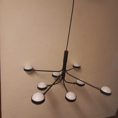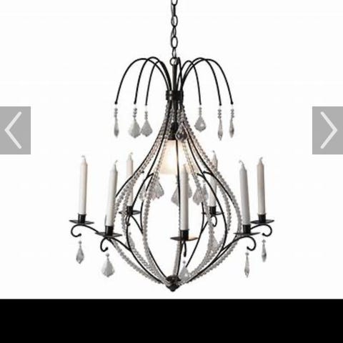 IKEA i svart metall med åtta ljuskällor. Taklampan har en modern design med utsträckta armar och rundade lampglas. Passar för allmän belysning i olika rum.