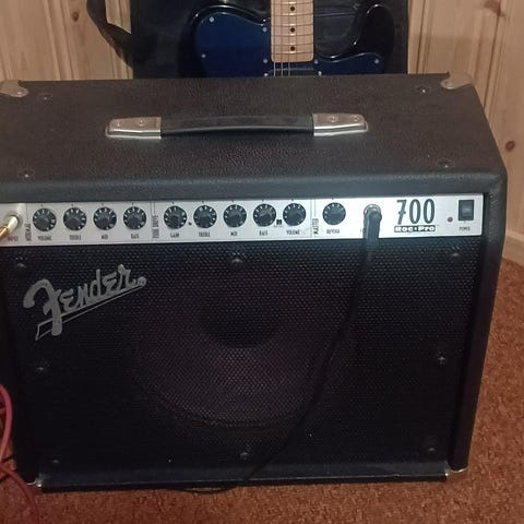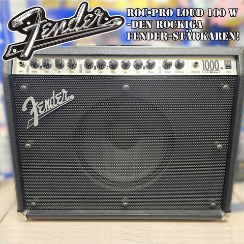 Fender Roc-Pro 1000 gitarrförstärkare i svart färg. Utrustad med flera reglage för ljudjustering på frontpanelen. Förstärkaren har en stor högtalare monterad på baksidan. Designad för gitarr med möjlighet att justera olika ljudparametrar. Passar för både övning och mindre framträdanden.