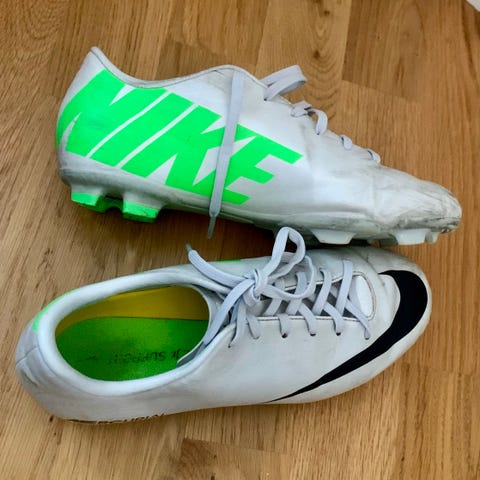 Nike Mercurial fotbollsskor i blå färg, storlek 32. Skorna är tillverkade i syntetmaterial och har dobbar för spel på gräsunderlag. Designade för att ge bra grepp och rörelsefrihet vid fotbollsspel.