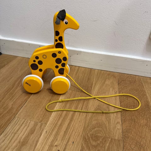 BRIO Dragleksak i form av en hund, svart kropp med gula öron och röda hjul. Leksaken är avsedd för barn och har en snöre för att dra med. Tillverkad av trä och plast.