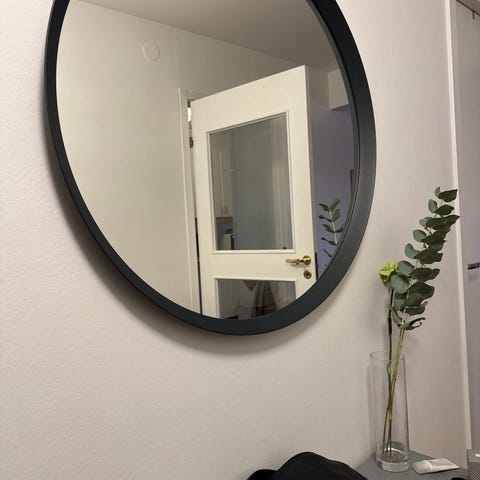 Rund spegel med vit ram och stativ. Spegeln är designad för att stå på bord eller byrå och har en enkel, funktionell design.