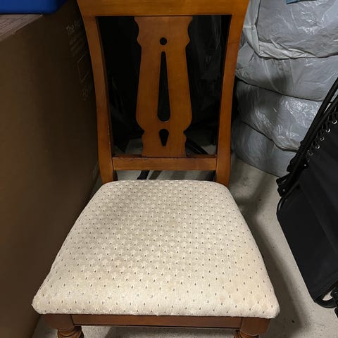 Ett matbord i massivt trä med 6 st stolar, allt i helt okej skick. En av stolarna är lite sprucken i sitsen.