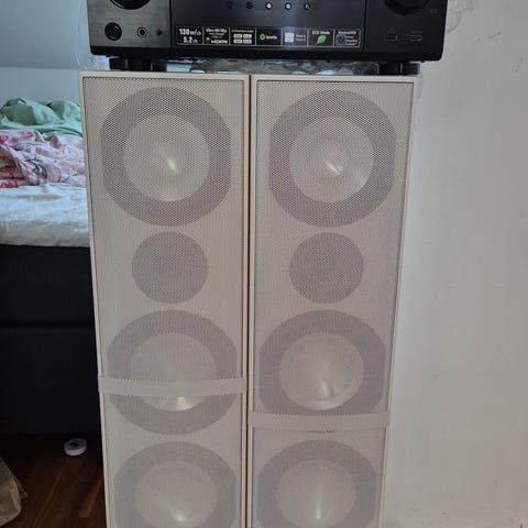 Det enda kosmetiska felet är att fanéret har släppt något på ena front högtalaren (se bild). Övriga högtalare är i perfekt skick.