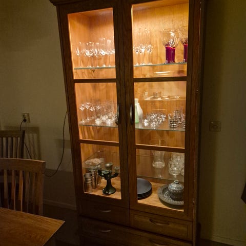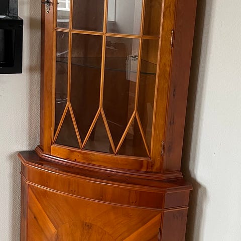 Vitrinskåp i trä med två glasdörrar och två lådor ovanför två träskåp. Skåpet har en klassisk design med dekorativa detaljer och passar för förvaring och visning av porslin eller andra föremål. Färgen är ljus och skåpet är avsett för inomhusbruk.
