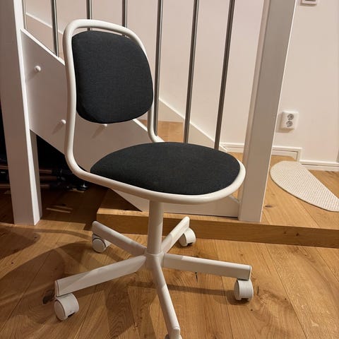 barnstol med svart sits och ryggstöd samt vit stomme. Stolen har hjul och är justerbar i höjd. Mått: bredd 39 cm, djup 34 cm. Passar för barn.