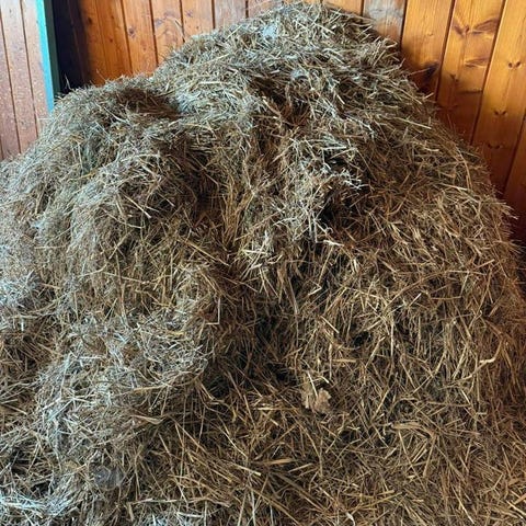 Massvis med halm som legat på loft länge, packat i lösa balar. Ej till djur, men kan användas till odling. Finns även hästgödsel både ren och blandad med halm. Brunnen och ny.