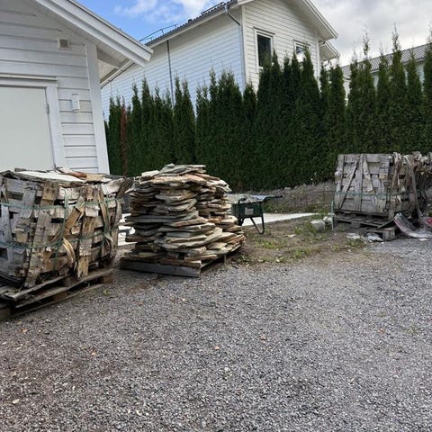 Oregelbunden grå skiffer i varierande storlekar. Passar för användning i trädgårdar, gångstigar och andra utomhusytor. Materialet är naturligt sten som ger en rustik och naturlig yta.