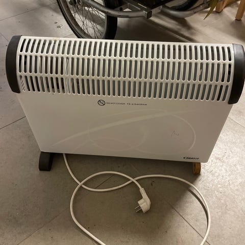 Nobo elektrisk konvektorvärmare i vit färg. Produkten är avsedd för uppvärmning av rum och är utrustad med en strömkabel för anslutning till eluttag. Enheten har en ventilationsöppning på översidan för värmeutsläpp.