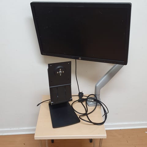 HP EliteDisplay E242 bildskärm med en skärmstorlek på 24 tum. Skärmen är svart och har anslutningar inklusive HDMI och VGA. Skärmen är avsedd för kontors- och allmänt bruk och har en justerbar fot för bättre ergonomi. Det finns mindre repor (inringade med rött på bilden), men de påverkar inte användningen. Gothenburg Trading.
