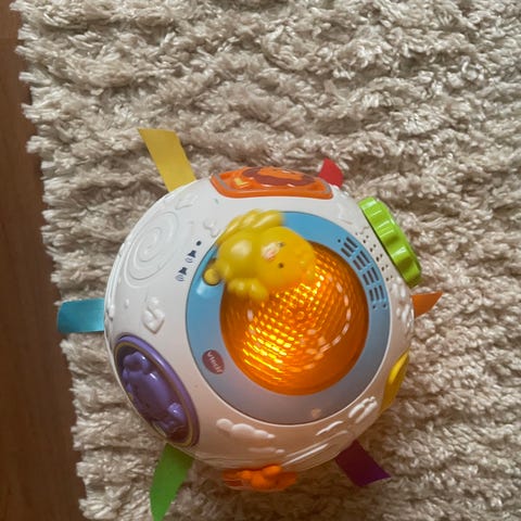 Leksak på hjul som snurrar iväg. Flera olika funktioner. Spegel, flyttbara "pärlor" och snurrvred med bilder som låter.