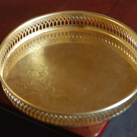 Oval bricka från Scandia Guld med dekorativa detaljer och handtag.