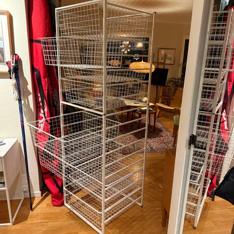 Bra förvaring. Sexkantig trådkorg där botten kan höjas efter behov. Passar bland annat som varukorg i affär.