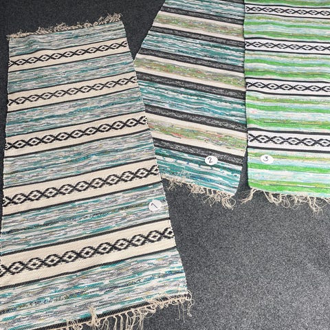 En helt ny hemvävd trasmatta i grönt, rosa, beige, vitt, gult och svart. Den är 3 meter lång . Fler bilder kan ordnas