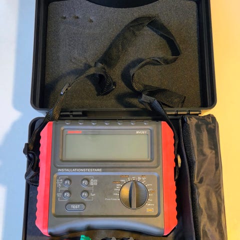 Bild 4: Aluminiumväska med Testboy 416/432-testare, Marelco vägguttagsprovare & diverse adapterkablar för kontroll av bland annat Perilex-uttag med mera.