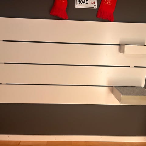 Vägghängd sänggavel med nattduksbord. Skönt med vägghängd som underlättar städning. Endast använd ca 1,5 år i ett gästhus så den är dom ny.