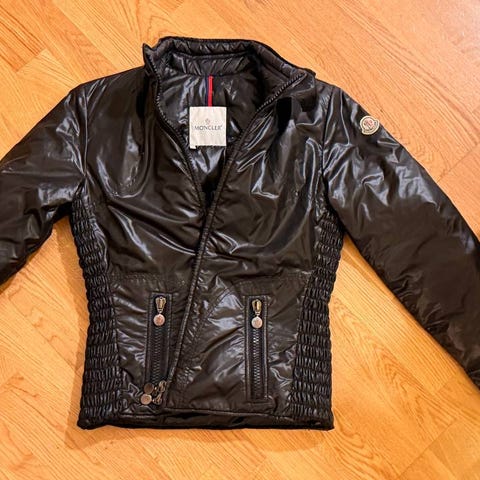 Moncler Vinterjacka i svart färg, storlek 5 för dam. Jackan är quiltad med glansigt material och har Monclers logotyp på ärmen. Den är avsedd för vinterbruk och ger isolering och skydd mot kyla.