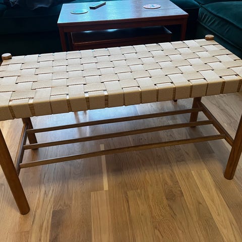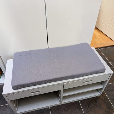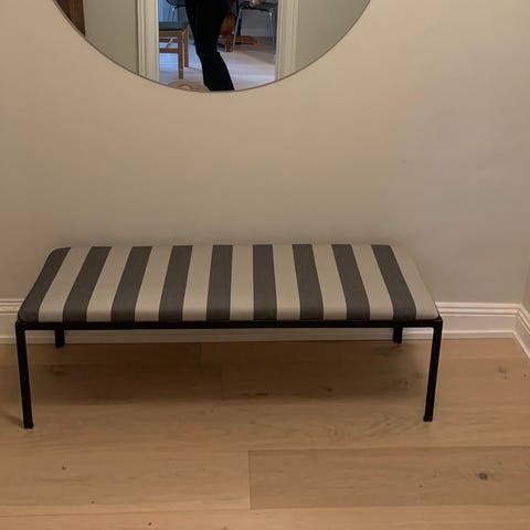 Bänk i massiv trä som fungerar till matplatsen eller hallen. Bra skick.