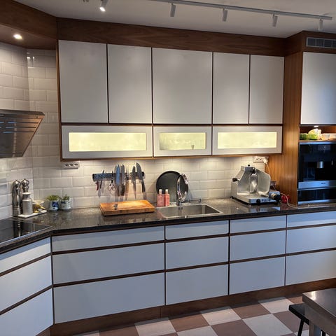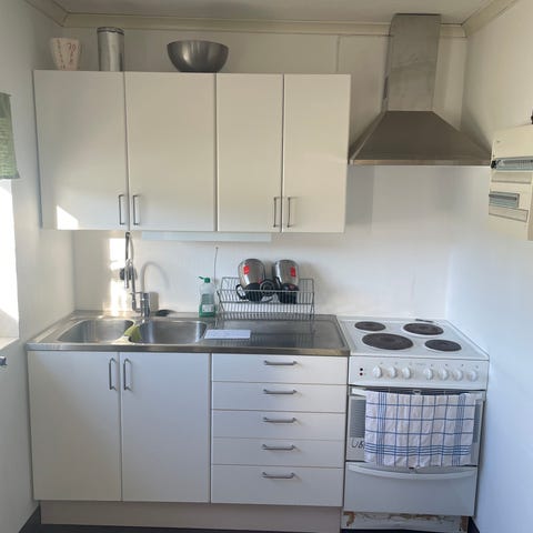 Stommar med flera lådor bakom vissa skåpsluckor. Köket är i helt ok skick men självklart finns nån enstaka repa och tillsågningshål för el etc efter användning.
