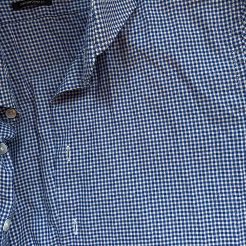 Skjortan är använd och tvättad så färgen är lite blekare på en del ställen. Så som det blir när man tvättar mörka kläder, inget som sticker ut och stör. Den är i 100% bomull.