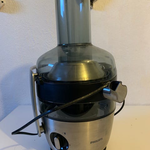 Braun Juice Extractor i vit färg. En elektrisk juicepress med kompakt design, lämplig för att pressa juice från olika frukter och grönsaker. Utrustad med strömkabel för anslutning till eluttag.
