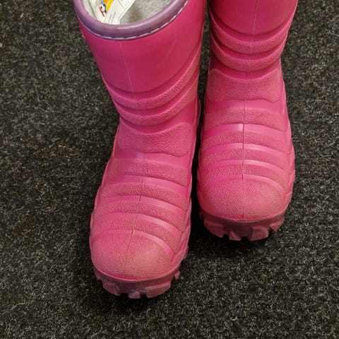 Stövlarna är rosa och svarta med stjärnmönster. Materialet är anpassat för att ge skydd och komfort vid användning i kallt och vått väder.