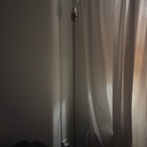 Den står på en fot på golvet som inte kom med riktigt på bilden ( en rund fot/platta)
