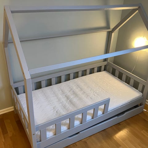 Hej! Säljer ett enkelt juniorsäng i trä med låda under sängen. Sänggavel i rosa. Ribbotten i trä. Hämtas på plats
