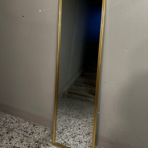 Spegel i mörkbrunt ”läder” utseende med mässingsfärgade nitar. Finns ej att köpa i Sverige.