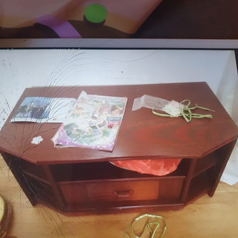 Hyllan i trä är vitmålad med avskavd färg på vissa ställen. I övrigt hel och stabil. Glas-skäpporna i mycket gott skick märkta IDEAL i botten.