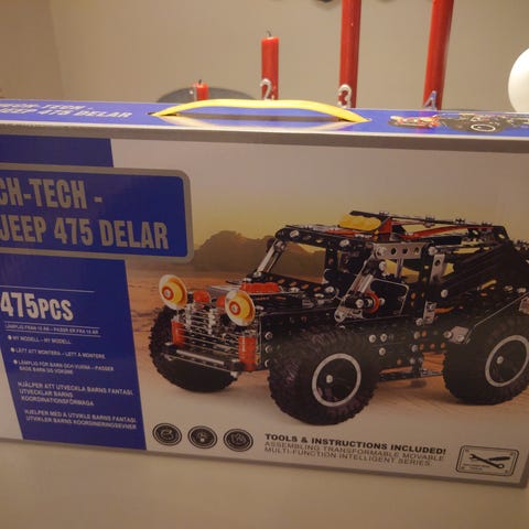 Alla bitar räknade och komplett byggsats. Kontroll medföljer så man kan styra bilen när man byggt den klart.