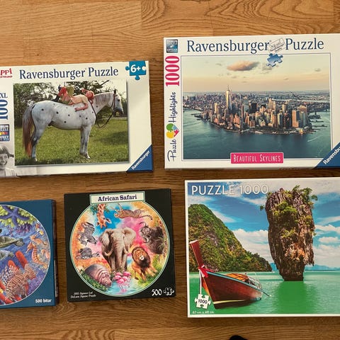 Set med pussel från Ravensburger och Schmidt, inkluderar flera pussel med 200 och 500 bitar. Motiven varierar och inkluderar djur, godis och landskap. Pusslen är tillverkade av kartong och lämpar sig för barn och vuxna för underhållning och hjärngympa.