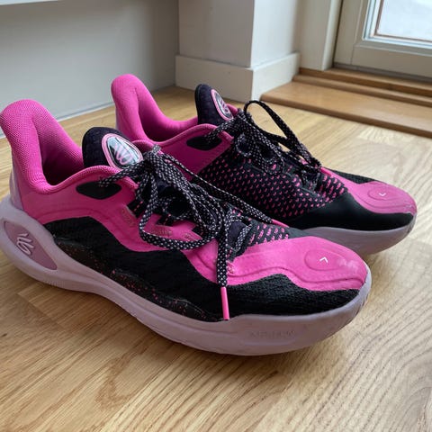 Under Armour Curry 8 basketkängor i röd färg med grön sula. Skorna är tillverkade i Vietnam och är storlek 42. Designade för basketspel med snörning och slitstark yttersula.