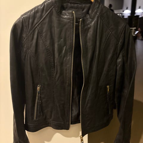 Svart skinnjacka med dragkedja fram och på fickorna från Rockandblue. Jackan har en tryckknapp i halsen och dekorativa detaljer nedtill. Läderjacka av mycket bra kvalitet. Mycket bra skick.