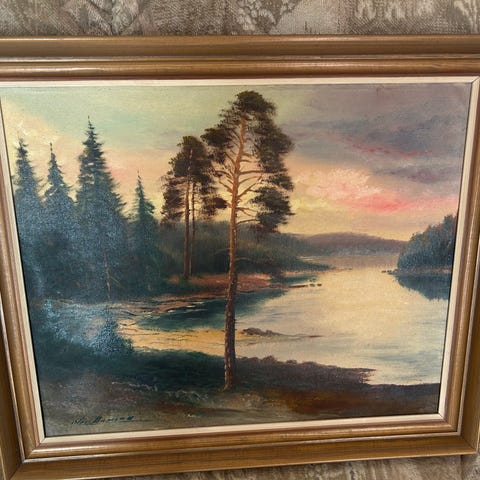 Äldre tavla med naturmotiv, står något om Vittangi på ramen.
