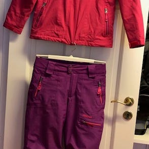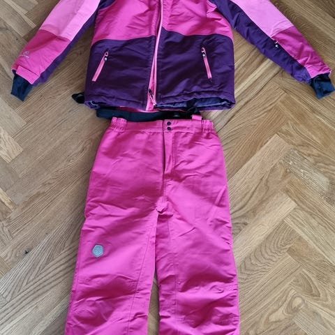 Five Seasons skidställ i storlek 134-140 för flicka, färg rosa. Använd av ett barn. Namnad. Jackan har inget synligt slitage alls. På byxorna syns ytterst lite slitage upptill, men det döljs av jackan. Jackan har ficka för liftkort.