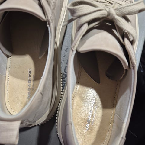 Vagabond sneakers i storlek 41 med beige färg. Skorna har snörning och en vit sula. Materialet verkar vara textil eller liknande. Passar för vardagligt bruk.