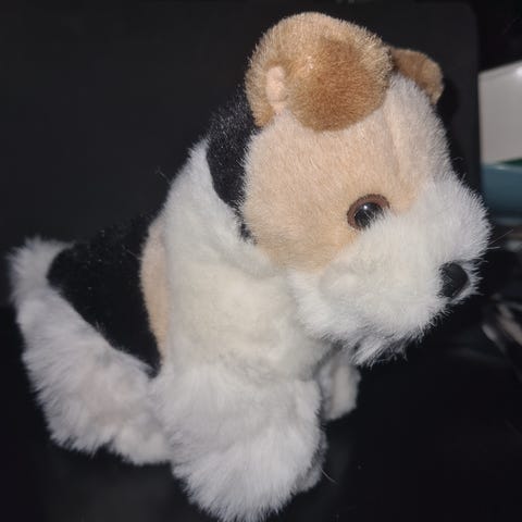 Plyschhund Barnleksak med grå och vit päls, blå ögon och rosa ryggsäck. Tillverkad av mjukt plyschmaterial och inkluderar ett liten rosa ben som den äter och bajsar ut när man lyfter på en av tassarna.