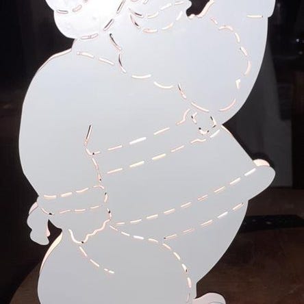 Rolig jultomte i plast, lyser vackert i mörkret. Står på en hemmabyggd fot / piedestal och är ca 1 m hög.