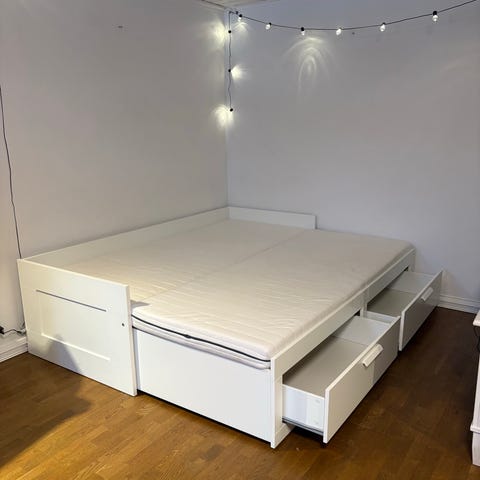 Sängen är i bra, använt skick. Några skavmärken förekommer, men inget som påverkar funktionen.