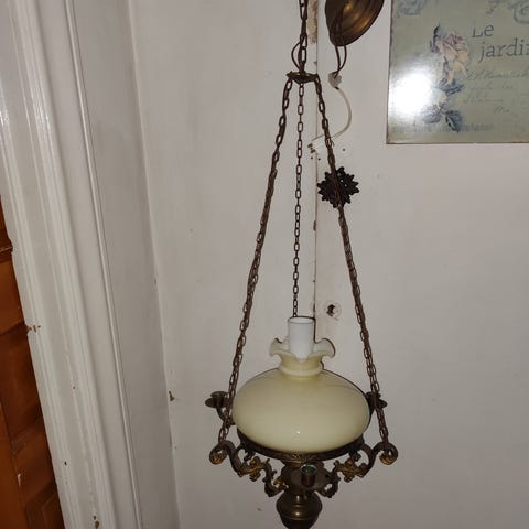 JÄTTEFIN ANTIK F.D FOTOGENLAMPA, NUMERA ÄR EL INDRAGEN MEN GÅR LÄTT ATT TA BORT OM MAN SÅ ÖNSKAR. DET FINNS EN MOTVIKT SOM MEFÖLJER LIKASÅ EN EXTRA GLAS-KUPOL I LIKNANDE UTFÖRANDE.