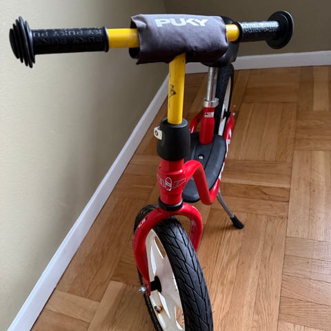 Kettler styrcykel i röd och gul färg, anpassad för barn. Cykeln har en ram i metall med justerbar sadel och handtag i plast. Hjul i plast med gummidäck för bättre grepp. Designad för att hjälpa barn att utveckla balans och koordination.