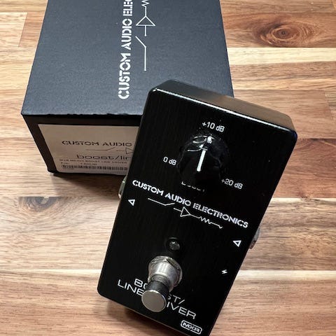 SL Drive Gitarrtillbehör med kompakt design och två reglage. Svart färg med guldtext. Används som effektpedal för gitarr.