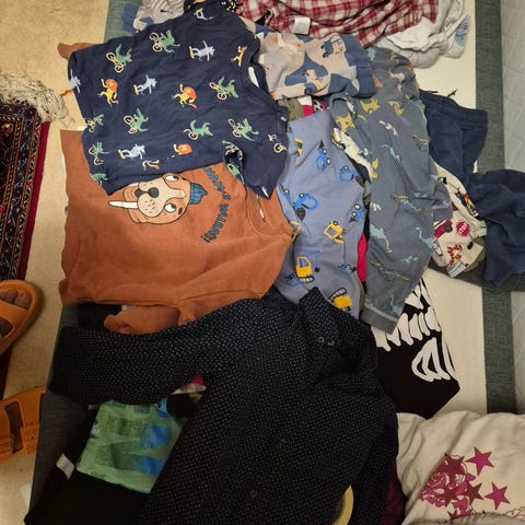 Blandade märken på barnkläder för pojke i storlek 92 med flerfärgat mönster. Setet innehåller olika plagg inklusive långärmade tröjor, byxor och skjortor i varierande färger och material. Passar för barn i storlek 92.