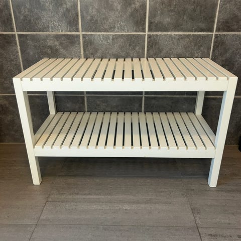 Köksbänk med två underskåp. Lackade gråa luckor. Troligen IKEA-skåp.