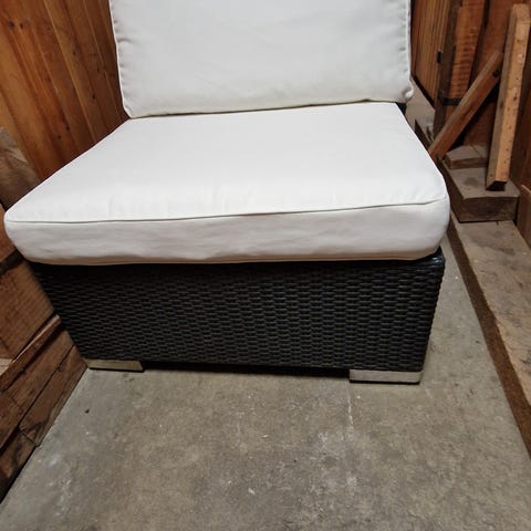 Utemöbelset bestående av två fåtöljer och en soffa med ett bord. Möblerna har stomme i metall och sitsar i tyg. Passar för utomhusbruk på till exempel balkong eller veranda.